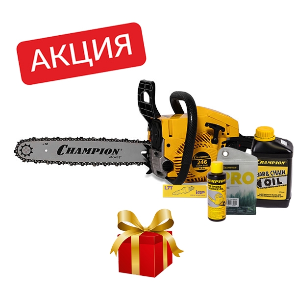 CHAMPION A246-15, Бензиновая цепная пила, 246-15"-0,325-1,3-64, 1,9 кВт, 45,8 см.куб., легкий старт + подарок: масло для цепи 1л; свеча; цепь; масло для 2-тактных двигателей 0,1л.