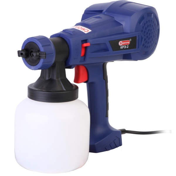 Диолд КРЭ-2, Краскораспылитель электрический, 400 Вт, 800мл, сопло 2,6 ммСреди изделий торговой марки "Диолд" имеется прибор, способный в прямом смысле украсить наш быт. Это современный краскопульт КРЭ-2, работающий по принципу инновационного безвоздушного распыления.Особая конструкция распылителя способствует созданию внутри емкости высокого давления на краску, вследствие чего последняя стремительно движется к выходному соплу. При выходе из краскопульта лакокрасочный материал освобождается от прессинга, приобретая такую скорость и такой заряд энергии, что происходит его дробление на мельчайшие частицы. Получается мелкодисперсный факел, сопровождаемый интенсивным испарением растворителя. В результате, лакокрасочный материал "мягко" и интенсивно ложится на окрашиваемую поверхность.Достоинств у краскопульта КРЭ-2 множество. Это и высокая производительность, и уменьшение расхода растворителей в связи с открывающимися перспективами использования более вязких жидкостей. Это и снижение потерь лакокрасочного материала на туманообразование, вследствие чего значительно уменьшается загазованность в помещении.Наиболее эффективно краскопульт КРЭ-2 проявляет себя при окрашивании крупногабаритных изделий и больших поверхностей, когда нанесенный материал, ложась даже одним слоем, достигает значительной толщины покрытия.Отличное безвоздушное распыление получается при нанесении на обрабатываемую поверхность антикоррозионных покрытий и прочих неэлектропроводных жидкостей.Многочисленные автомобилисты пользуются краскопультом КРЭ-2, окрашивая своих "железных коней". Профессиональным малярам этот продуктивный аппарат помогает покрыть лаком или краской полы и панели помещений. Столяры с их помощью пропитывают деревянные изделия.Краскораспылитель является инструментом бытового назначения и предназначен для распыления лакокрасочных материалов, грунтовок, морилок, средств защиты древесины и растений, масел, антикоррозионных покрытий, дезинфицирующих средств на основе растворителей и воды, а также других неэлектропроводных жидкостей на обрабатываемые поверхности методом безвоздушного распыления.Краскораспылитель не пригоден для распыления щелочей, кислотосодержащих материалов, материалов с твердыми составляющими и материалов с затрудненным распылением и каплеобразованием.Краскораспылитель предназначен для эксплуатации в районах умеренного климата, исполнения УХЛ, при температуре окружающего воздуха от плюс 5°С до плюс 35°С и относительной влажности воздуха 80 % при 15°С.Краскораспылитель работает от сети переменного тока напряжением 220 В, частотой 50 Гц..Класс защиты краскораспылителя – II (с двойной изоляцией).Режим работы краскораспылителя повторно-кратковременный 15/5 мин (15 мин. - работа, 5 мин. - пауза).Хорошее распыление лакокрасочного материала позволяет успешно применять краскопульт для:- окраски автомобилей, мотоциклов, стен помещений;- покрытия лаком полов, мебели, панелей;- нанесения различных антикоррозийных покрытий;- пропитки и защиты древесины;- консервации машин, узлов и деталей;- подачи смазывающих веществ в труднодоступные узлы автомобилей.Технические характеристики Диолд КРЭ-2, Краскораспылитель электрический