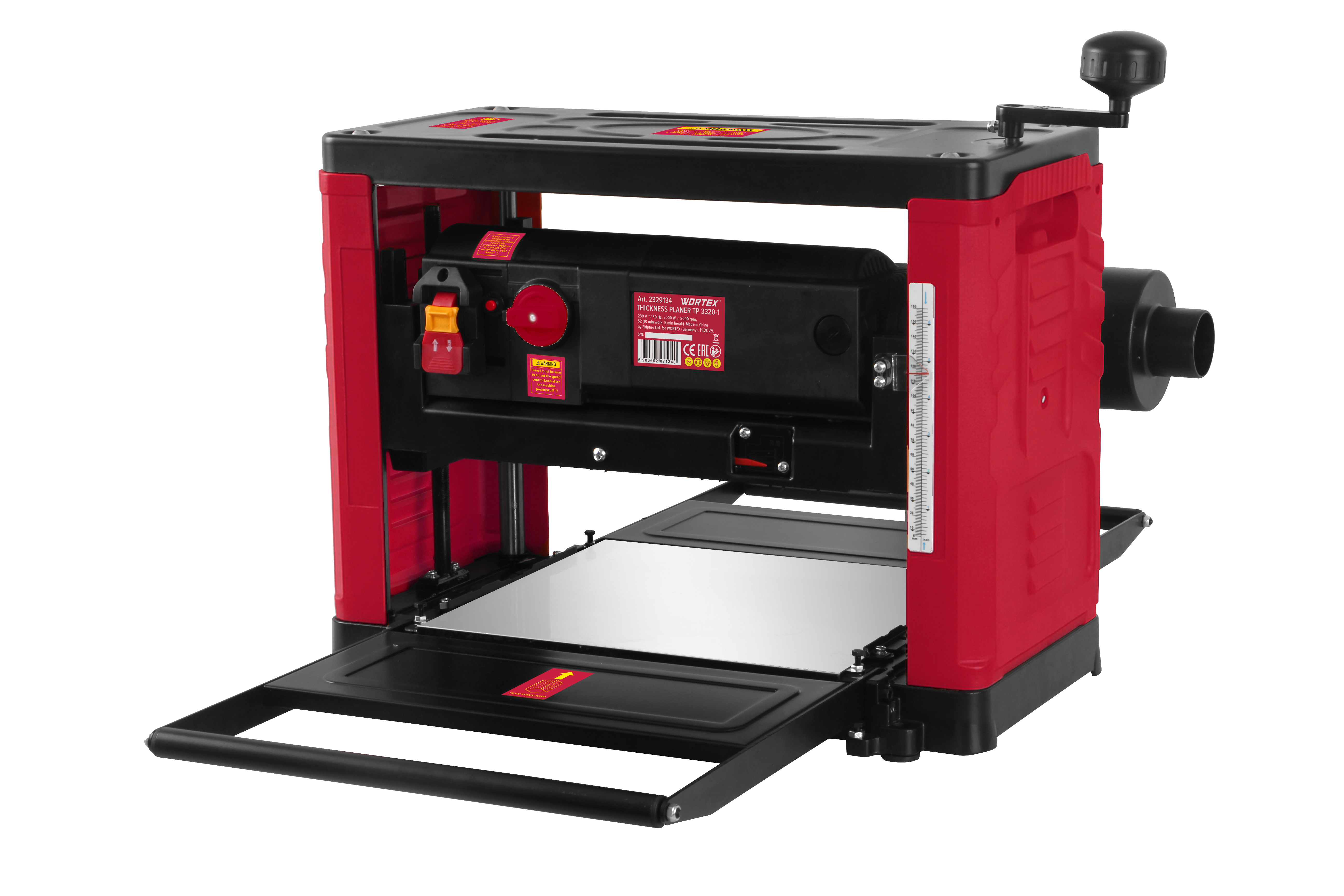 Питание: сеть,Напряжение: 230 В,Частота: 50 Гц,Мощность: 2000 Вт,Обороты строгального вала: 8000 обмин,Ширина строгания: 330 мм,Глубина строгания: 3,0 мм,Минимальная длина заготовки: 160 мм,Диапазон высоты строгания: 6-160 мм,Скорость подачи заготовки 4.3 м/мин, 7 м/мин,Количество ножей: 3,Вес: 30,5 кг.,Трехножевой вал для более качественной обработки заготовки,Регулировка скорости подачи заготовки (2 скорости),Увеличенная ширина и глубина строгания,Патрубок для подключения пылесоса,Легкий доступ к угольным щеткам,Рукоятка регулировки высоты, Миллиметровая шкала, Раскладные стальные удлинители рабочего стола с роликами, Защита от перегрузки,Боковые рукоятки для переноски, Резиновые опоры, Кнопка восстановления термопредохранителя, Отверстия для крепления к столу,Рейсмусовый станок создан для точной, чистой и стабильной обработки заготовок из дерева в мастерских. Трехножевой вал обеспечивает высокое качество строгания с минимальным количеством последующей шлифовки, а увеличенная ширина и глубина строгания позволяют обрабатывать более крупные детали за меньшее число проходов. Две скорости подачи дают возможность добиваться более качественного результата при работе с различными типами древесины. Для удобства и чистоты рабочего процесса станок оснащен патрубком для подключения пылесоса, а раскладные стальные удлинители рабочего стола с роликами надежно поддерживают длинные заготовки, предотвращая завалы и задиры. Рукоятка регулировки высоты в сочетании с наглядной миллиметровой шкалой обеспечивает точную обработку. Безопасность и надежность работы обеспечиваются защитой от перегрузки и кнопкой восстановления термопредохранителя, что защищает двигатель в тяжелых условиях эксплуатации. Легкий доступ к угольным щеткам упрощает обслуживание и продлевает срок службы инструмента. Для удобства перемещения предусмотрены боковые рукоятки, а устойчивость на рабочей поверхности обеспечивают резиновые опоры и отверстия для жесткого крепления к столу. Материал: боковые крышки - пластик, верхняя крышка - сталь, основание и корпус - алюминийСтанок рейсмусовый,Рукоятка регулировки высоты,Ножки (4 шт.),Винт (2 шт.),Ключ шестигранный,Ключ рожковый,Паспорт,2329155 Ножи для рейсмусового станка 2 шт. WORTEX для TP 3320-1