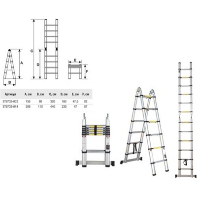 Количество ступеней 2х5Расстояние между ступенями, см 30приставная лестница (320см)двусторонняя стремянка (156см)Расстояние между опорами лестницы в модификации стремянка, см 80Размер при хранении в сложенном виде (высота,см) 82Ширина лестницы (от опоры до опоры),см 47,5Общая ширина лестницы (с подставкой),см 67Максимальная нагрузка, кг 150Масса изделия, кг 11.10